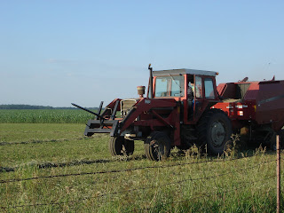 Here little G is riding along with Grandpa while he bales hay - the "big round bale" variety. Check back later for square baling and a description of both.